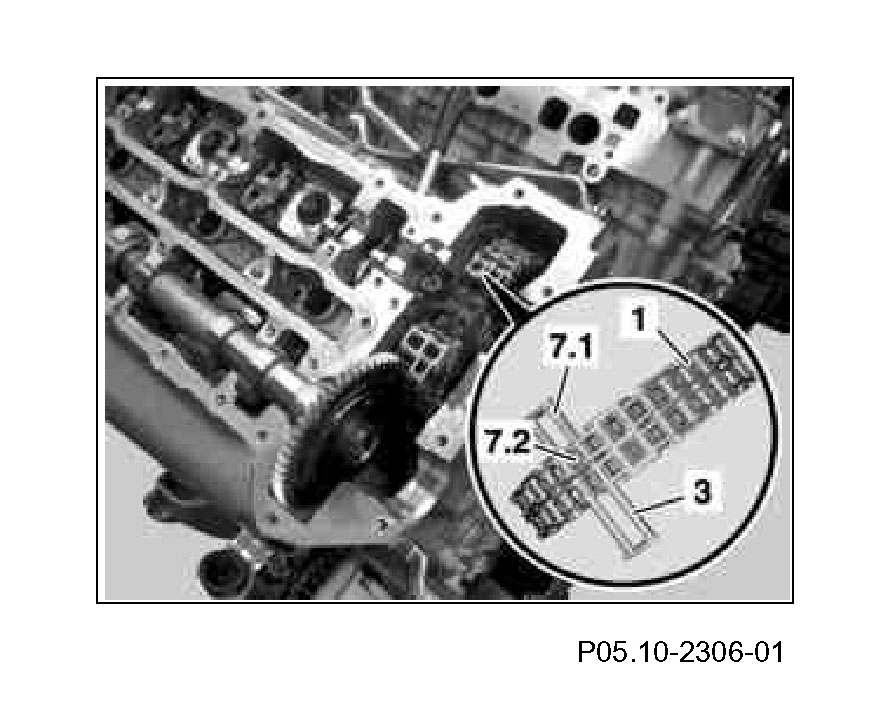 2 Insert new rivet element (7.1) and new middle plate (7.2) together with centering fork (3) into the ends of the new timing chain (1). Secure new center plate (7.2) with new rivet element (7.1).