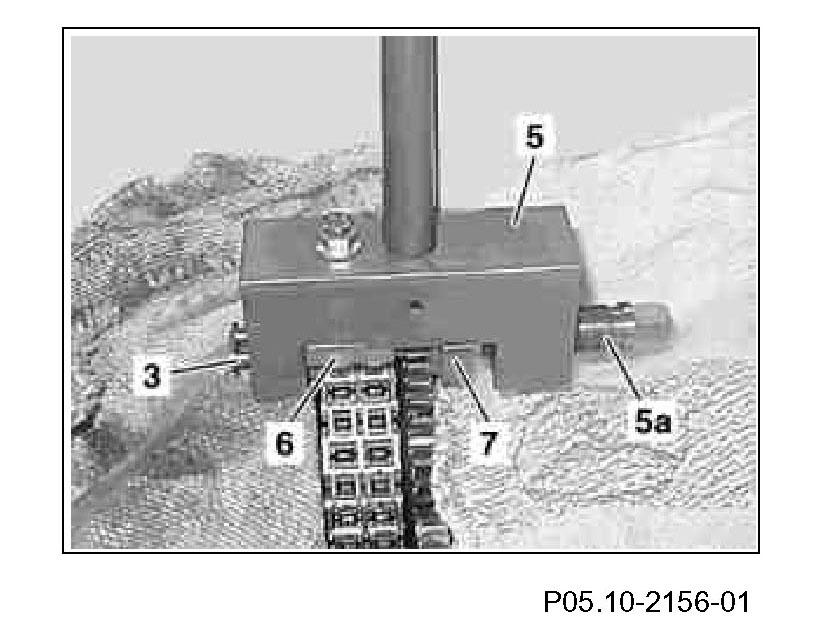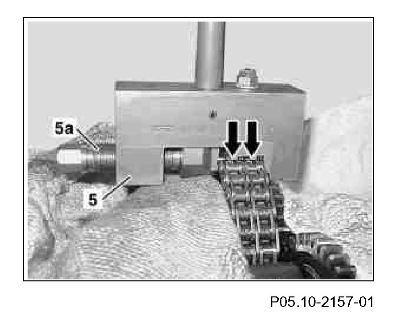 17 Loosen pressure pin (5a) and attach rivet press tool (5) to second timing chain bolt of the new rivet element (7.1).