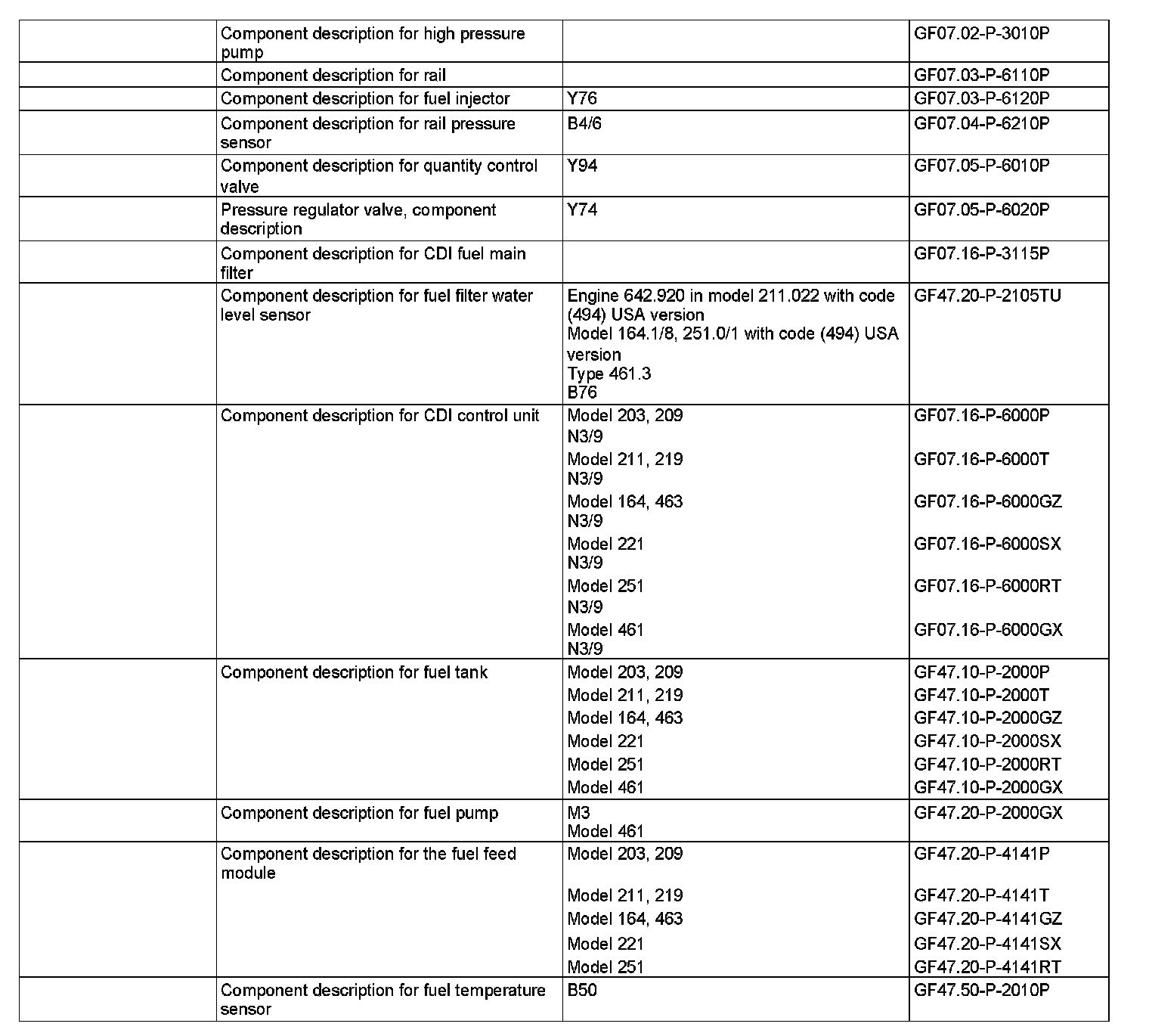In model 211.022 with OM 642.920, in model 164 and in model 251 with code (494) USA version, the fuel main filter is fitted a fuel filter water level sensor (B76) water level detection in the main fuel filter.