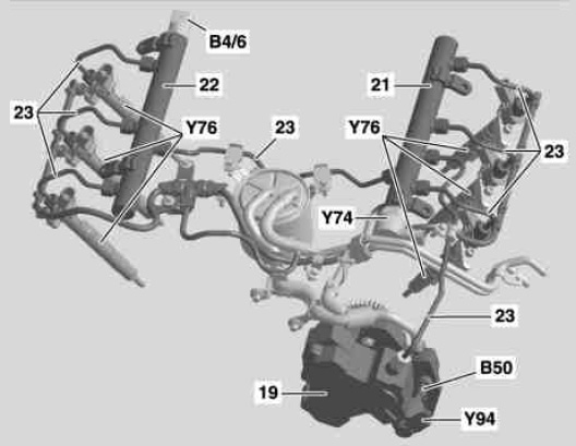 After switching off the engine, there is a residual pressure of about 50 to 80 bar in the high-pressure control circuit. The high-pressure system may only be opened after completely relieving the pressure on safety grounds.