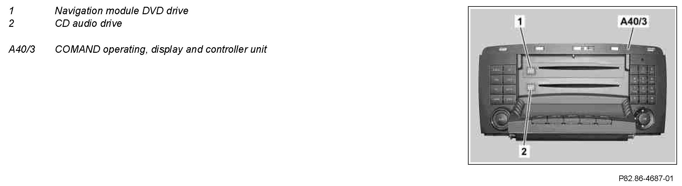 The DVD drive of the navigation module on vehicles with code (530) COMAND APS USA (with navigation system) is not suitable for playing video media (DVD Video, CD video or the like). The drive is only used for reading in the navigation DVD.