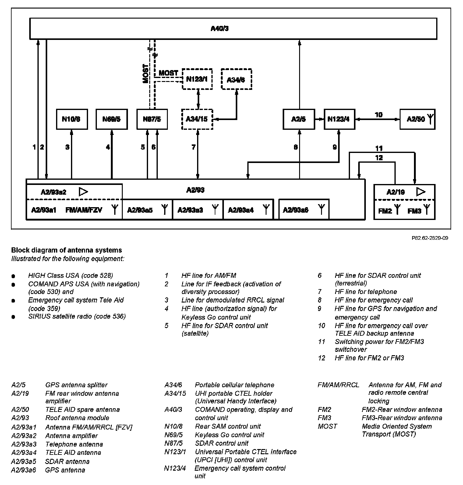 All systems required for navigation with the exception of the GPS antenna (A2/93a6) and GPS antenna splitter (A2/5) (only with TELE AID emergency call system (code 359)), are contained in the COMAND, operating, display and control unit (A40/3).
