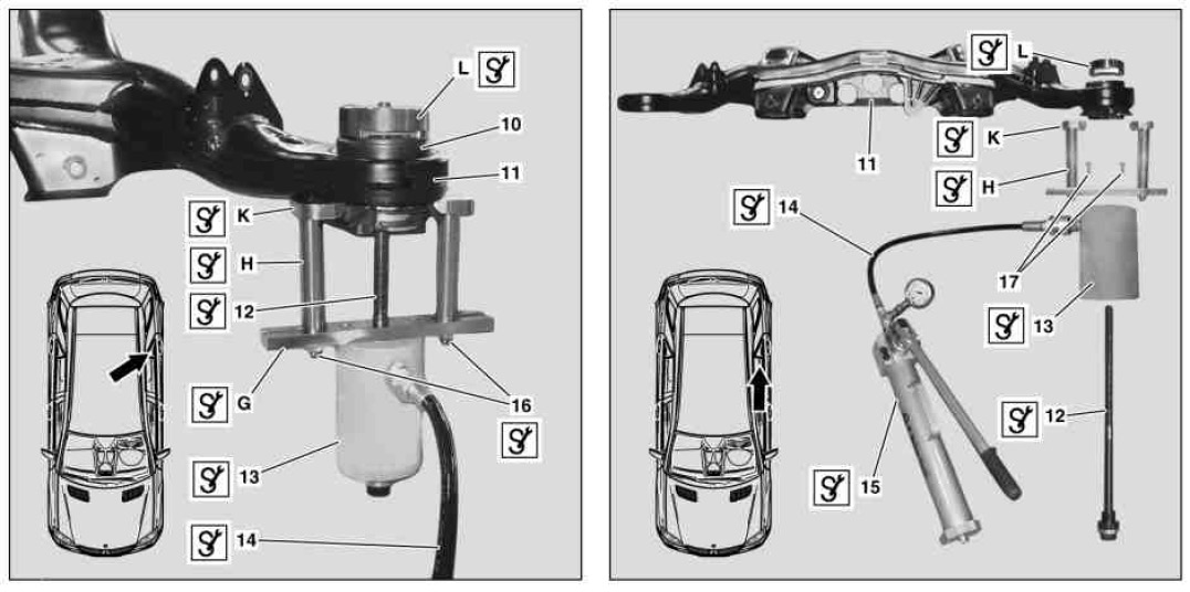3 Feed the threaded spindle (12) through the hollow cylinder (13), the plate (G) and the front rubber mount (10) and screw on the press-out sleeve (L).
