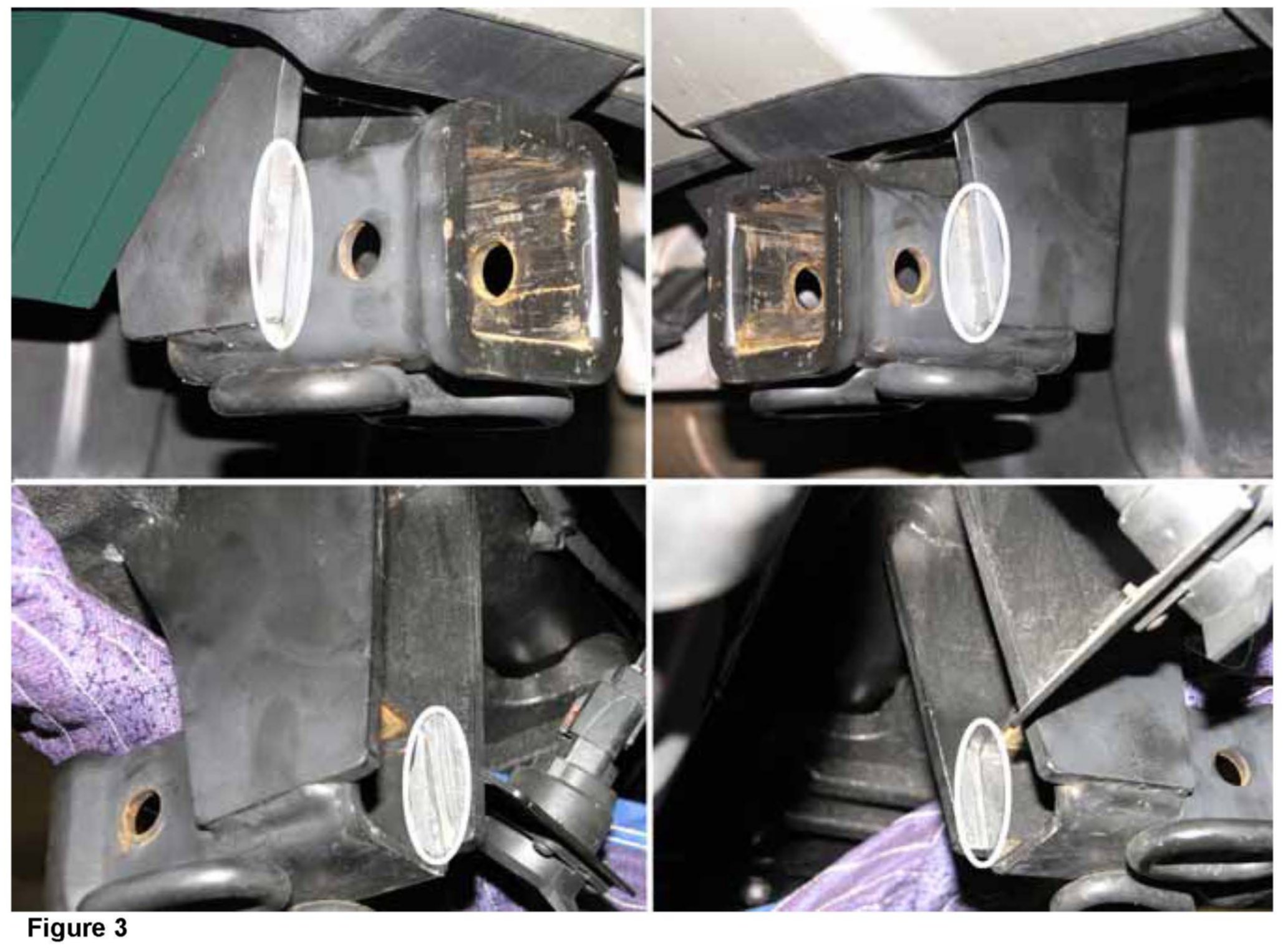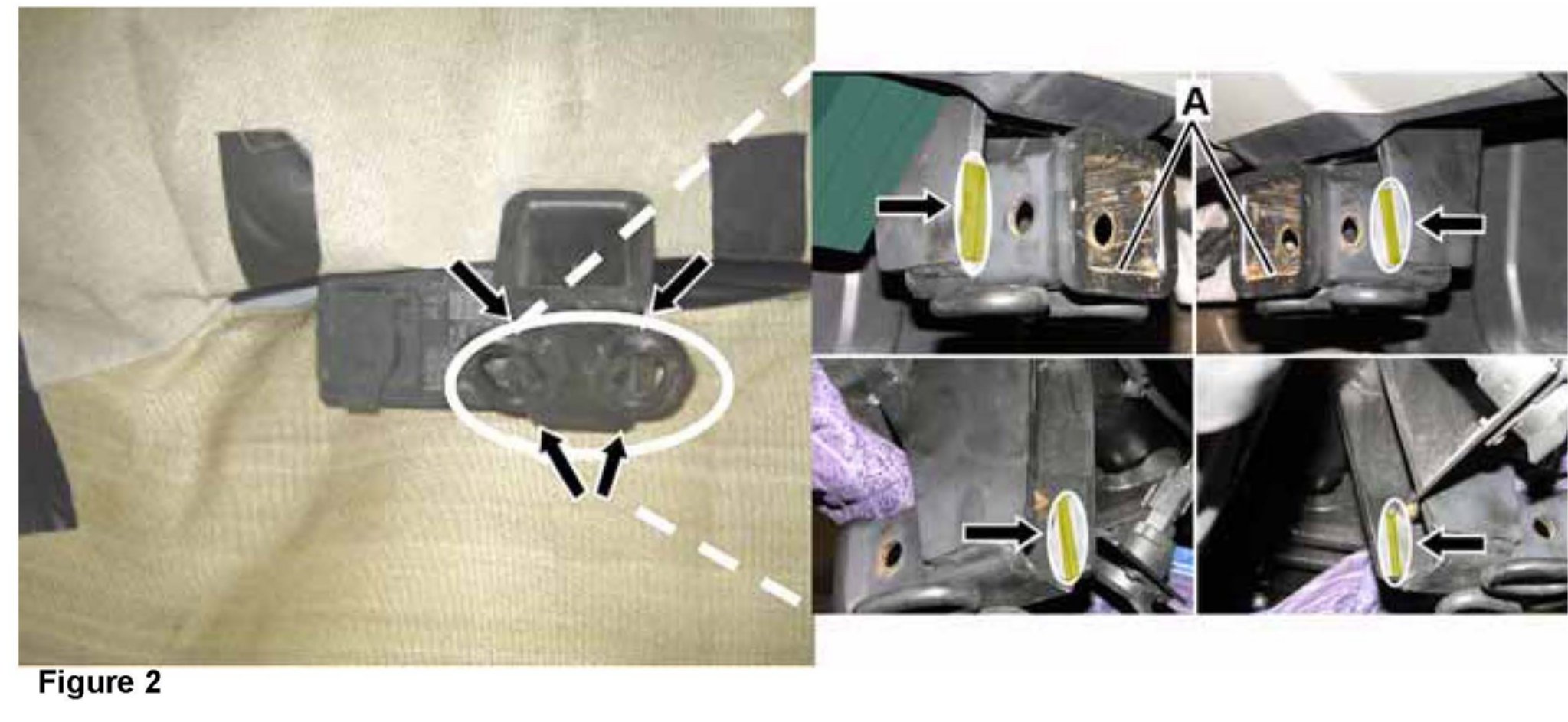 4. Thoroughly grind 4 weld point surfaces (arrows, Figure 2) and welder's ground point (A) down to bare metal using a die grinder with a burr bit (refer also to Figure 3 for view of weld points ground down).