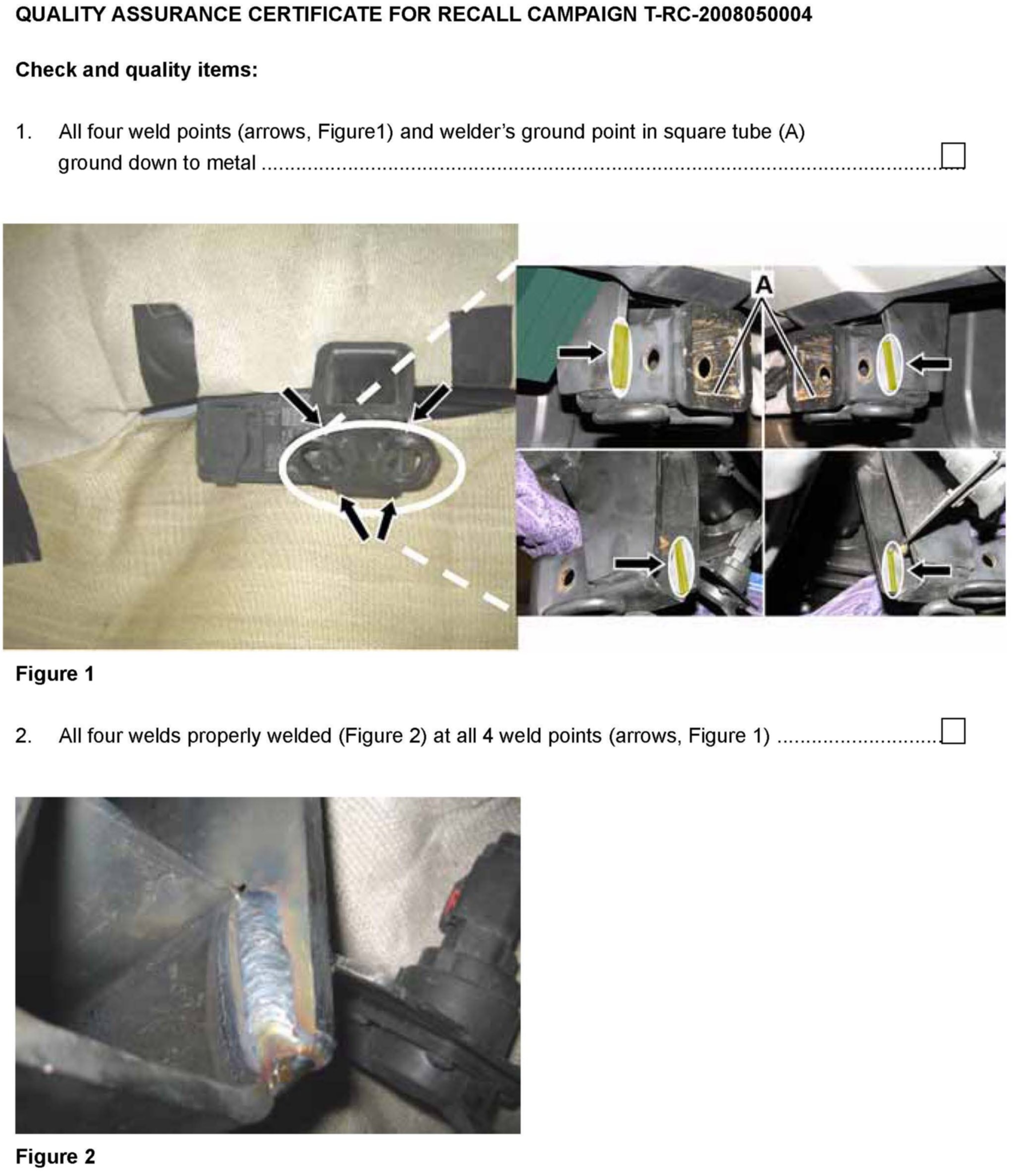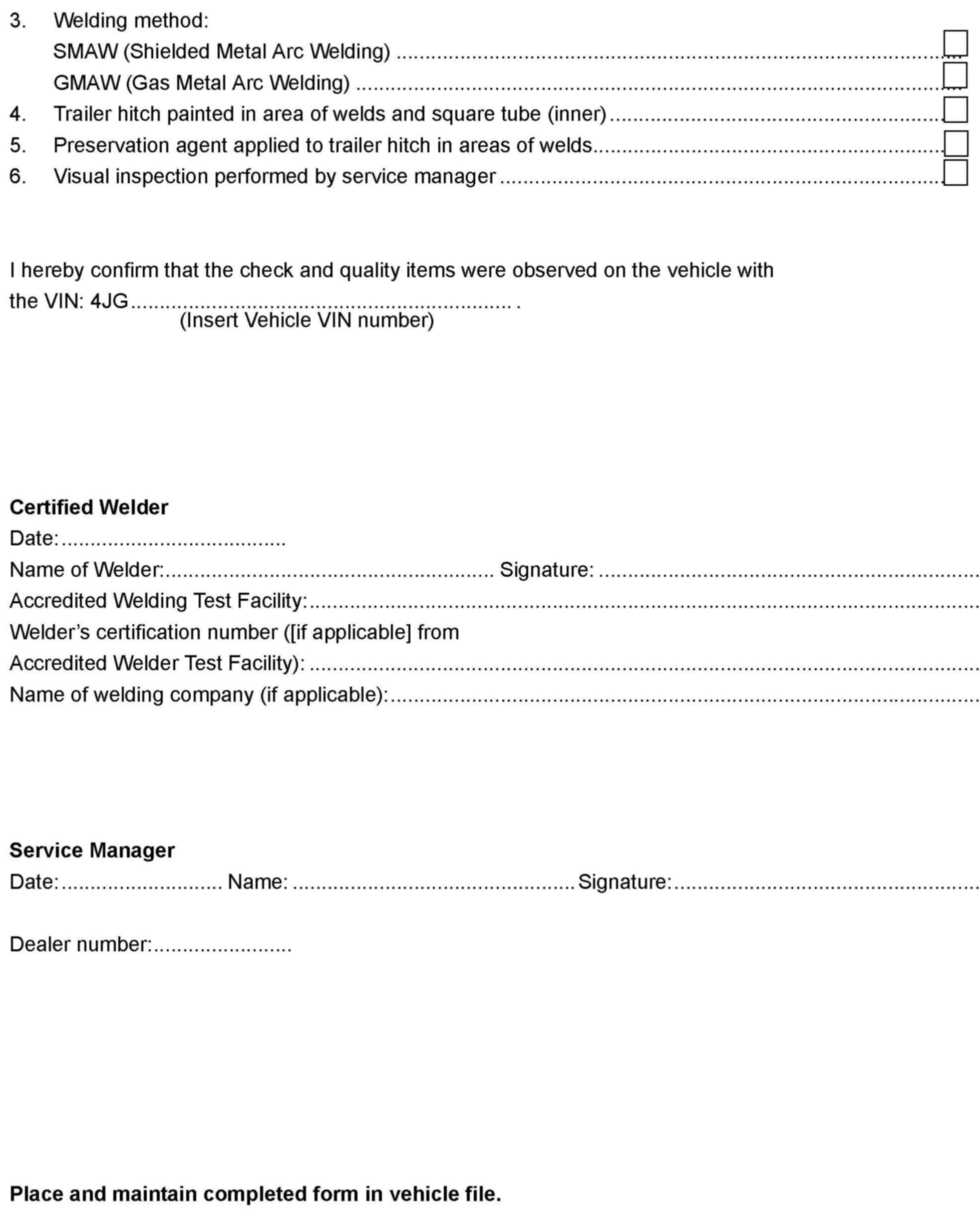 This vehicle repair requires welding to be performed. Welding is to be performed by a CERTIFIED WELDER certified for GMAW (Gas Metal Arc Welding) also known as MIG welding or SMAW (Shielded Metal Arc Welding) also known as stick welding; WHO HAS BEEN CERTIFIED BY ANY ACCREDITED WELDER CERTIFICATION PROGRAM (e.g., American Welding Society [AWS], National Registry for Certified Welders, I-Car etc. [other accredited welding certification programs are also acceptable]). Submitting a claim for reimbursement for this work constitutes dealer's representation that the work was performed by a certified welder as indicated above.