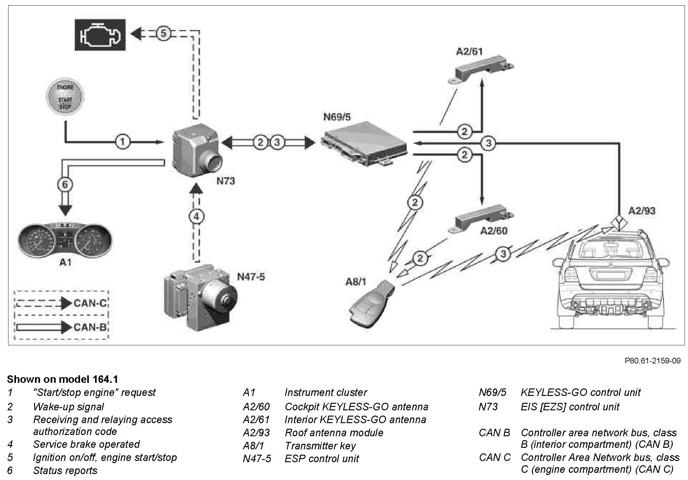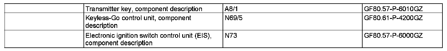 Parallel to this, the KEYLESS-GO control unit searches for and wakes up a valid transmitter key via the KEYLESS-GO cockpit antenna and the KEYLESS-GO interior antenna. The position of the transmitter key is transmitted to the KEYLESS-GO control unit via the roof antenna module. The KEYLESS-GO control unit transmits the access authorization code to the EIS control unit via CAN B.