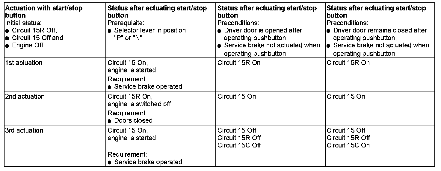 If the start/stop button is pressed, without the foot brake being operated, circuit 15R is switched on. Repeated actuation actuates circuit 15. Repeated pressing switches off the circuit 15. If the driver door is closed, circuit 15C remains active for approx. 30 minutes.