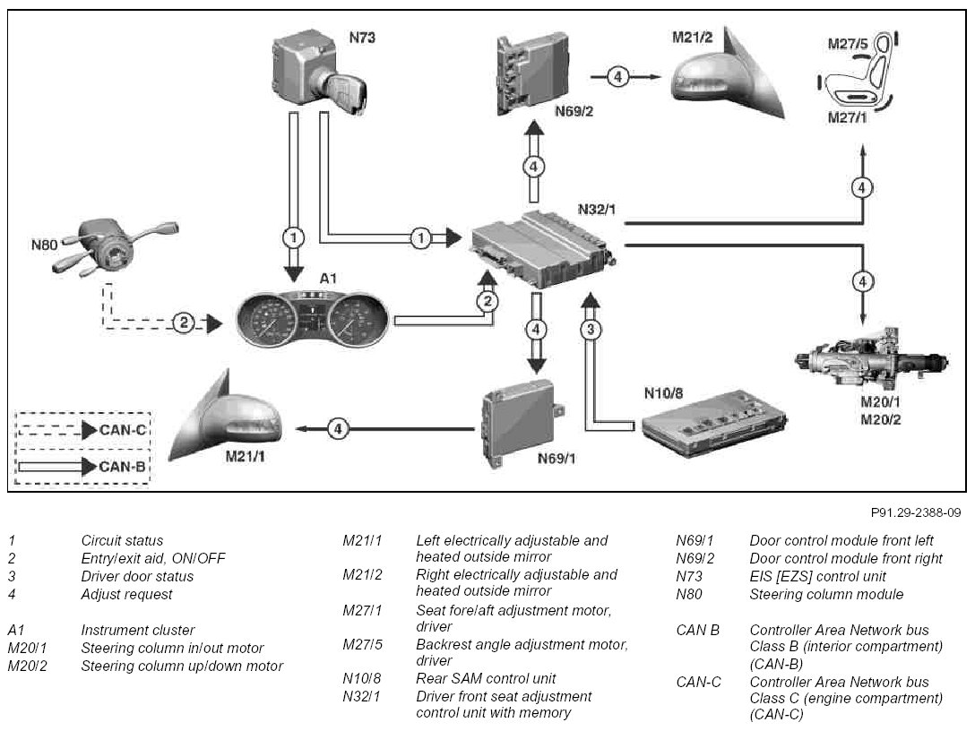 Evaluation of the required signals and the adjustment of the seat and steering column are performed by the driver front seat adjustment control unit.