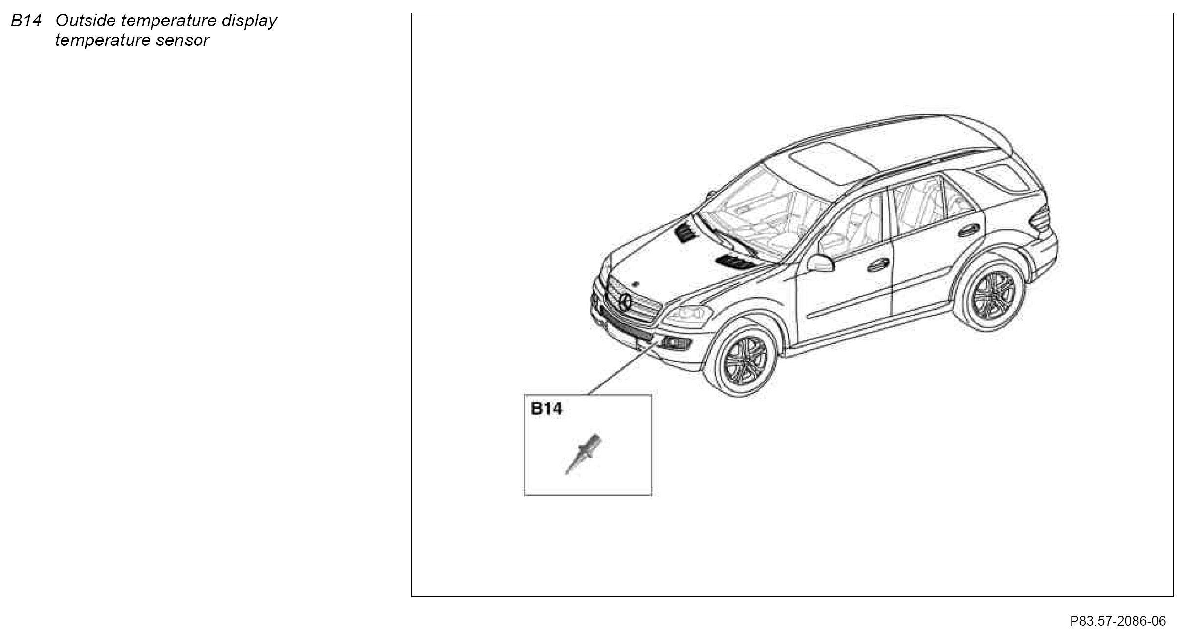 The temperature sensor changes its resistance depending on the outdoor temperature. It is read in by the instrument cluster (A1) and the reading is indicated on the multifunction display (A1p13).