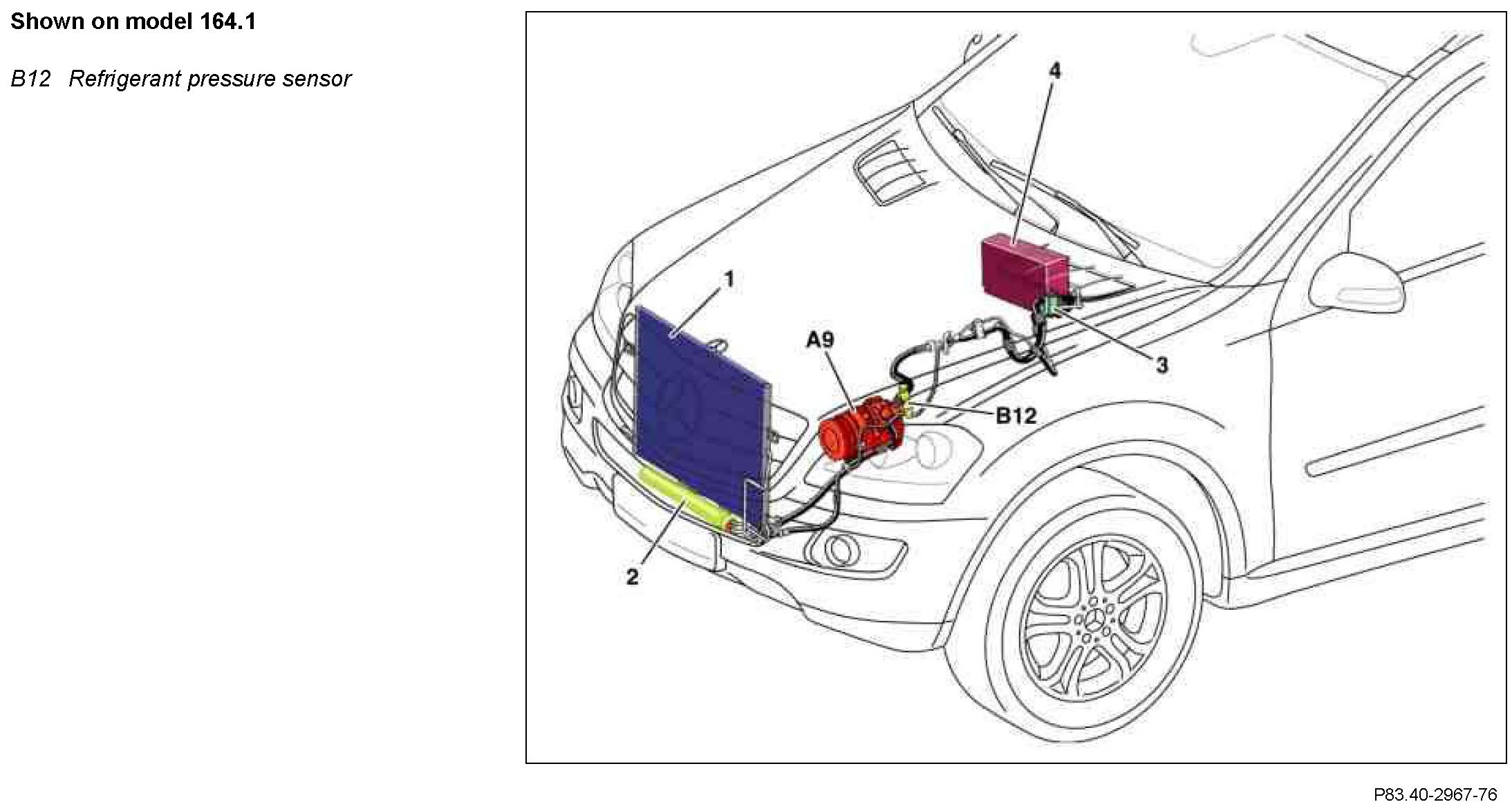 The refrigerant pressure sensor is located in the engine compartment at the front left on the high pressure line between the refrigerant compressor (A9) and condenser.