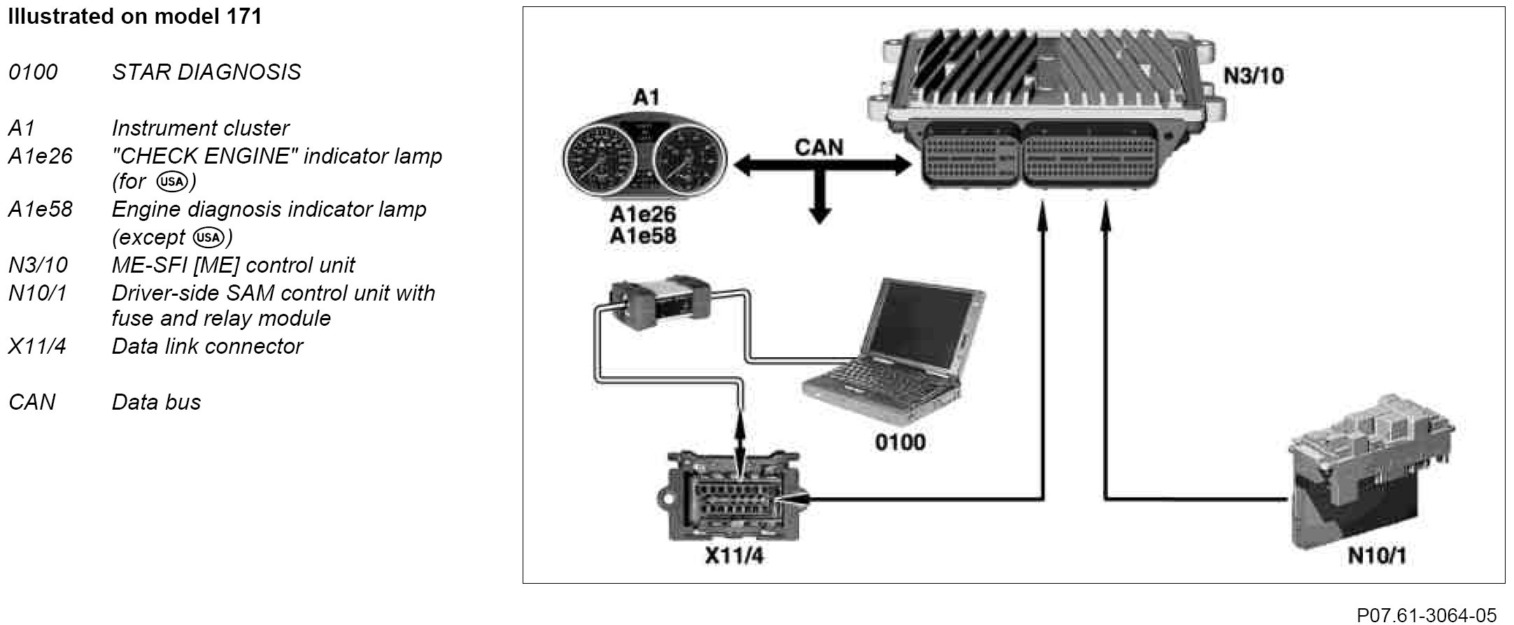 The ME-SFI [ME] control unit is connected via a serial interface (Kline) to the data link connector. The stored faults can be read out and deleted with STAR DIAGNOSIS or with a standard output device (generic scan tool) with "Ignition ON" or with the engine running via the data link connector (SAE standard ISO 9141-2).