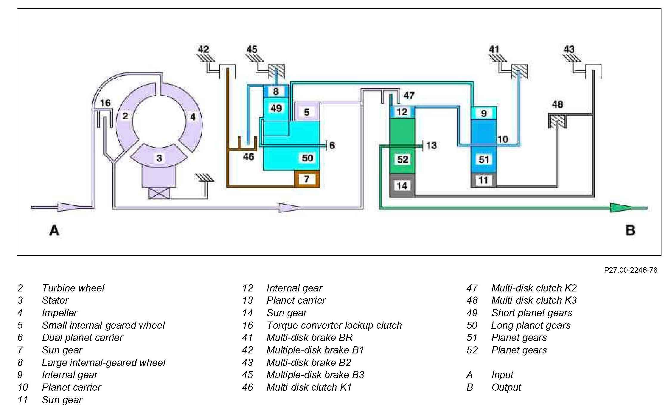 The small ring gear is driven via the transmission input shaft. The long planetary gears drive the short planetary gears which roll in the large stalled ring gear. The torque increased as a result and the rpm reduced as a result are transmitted to the double planet carrier.