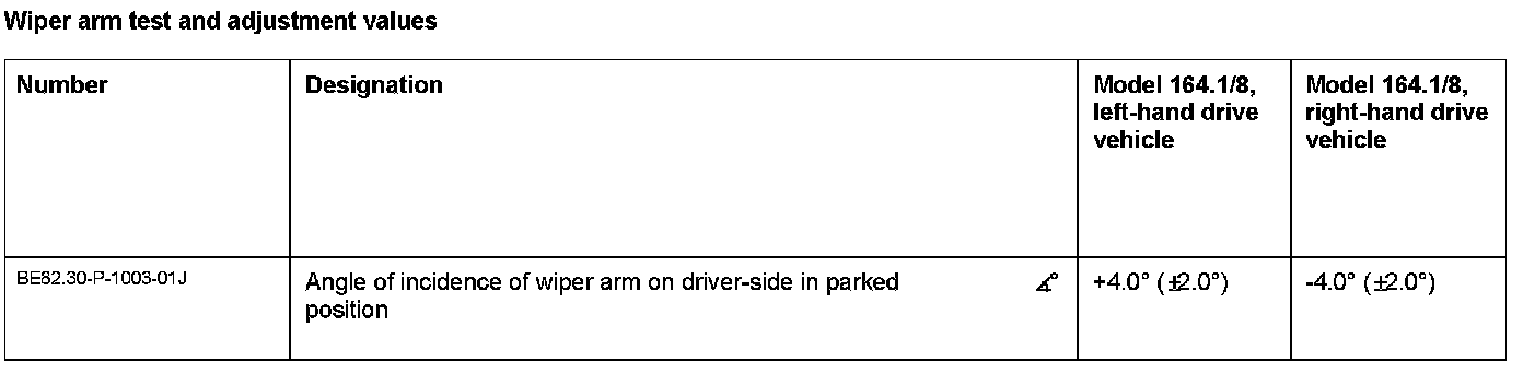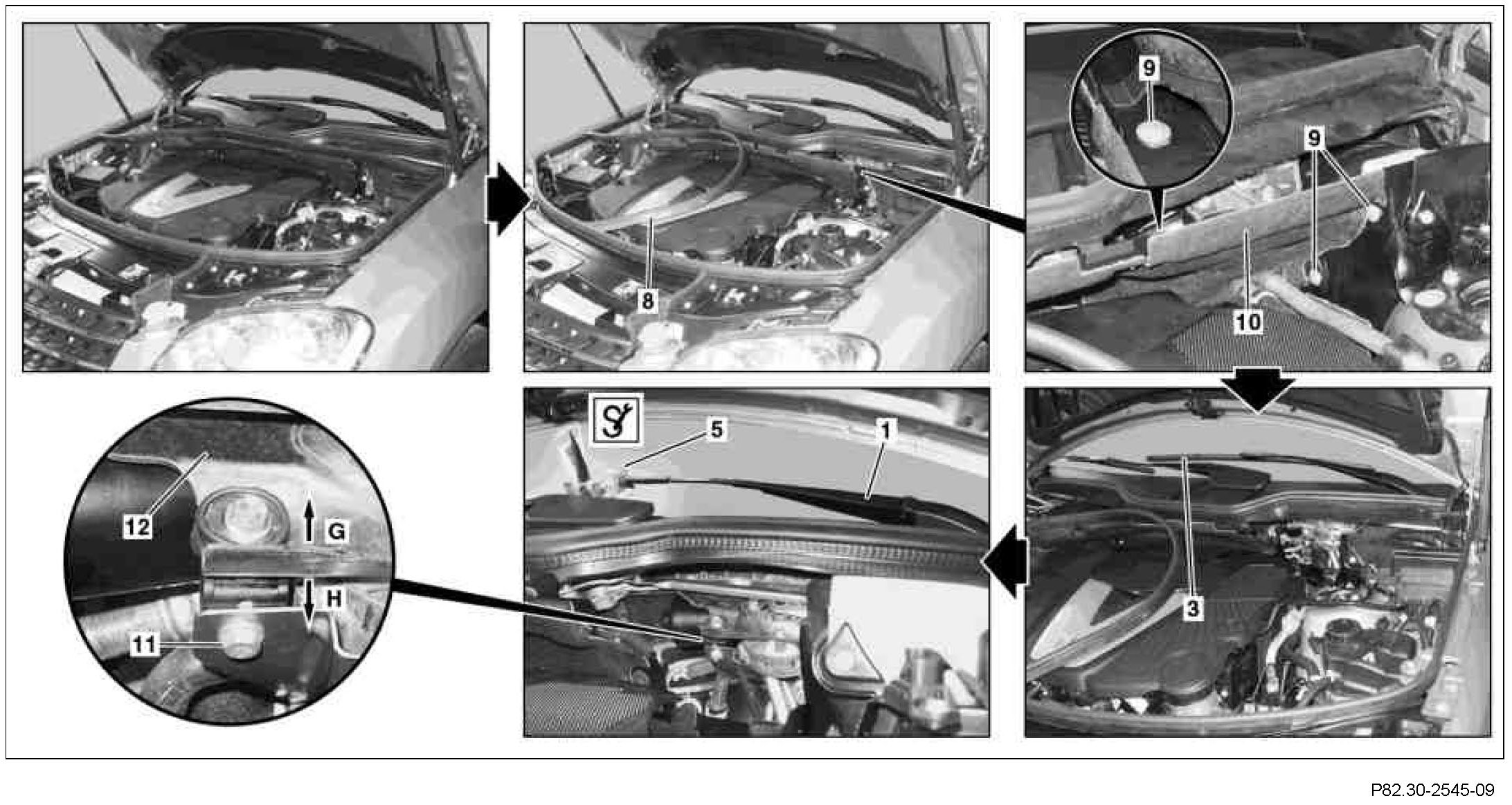8 Loosen bolt (11), enlarge the angle of incidence of the driver- side wiper arm (1) by lifting (arrow G) the wiper system (12) or reduce it by lowering (arrow H) the wiper system (12). Tighten bolt (11) if the angle of incidence is correct.