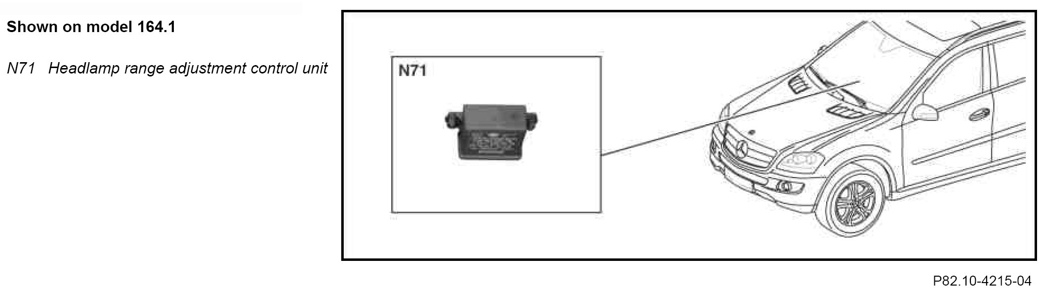 The headlamp range adjustment control unit is a subscriber of the Controller Area Network bus class C (engine compartment) (CAN-C) and also exchanges data with the HRA [LWR] power module (E1n3) and the HRA [LWR] power module (E2n3) via a serial interface.