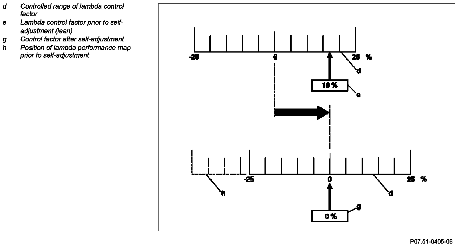 If faults occur, the ME-SFI [ME] control unit automatically makes a correction in the mixture formation. Here the lambda performance map is shifted within certain limits in such a way that the lambda control is not at the upper or lower regulation limit (d).
