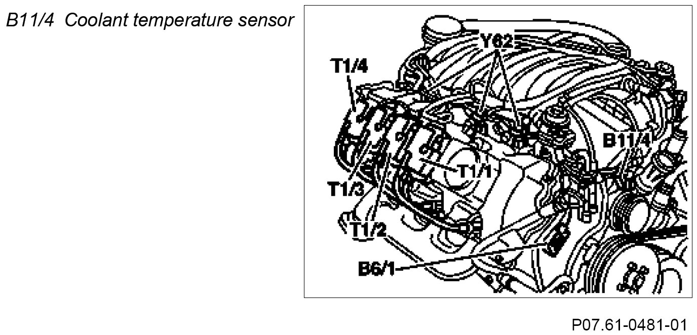 The NTC resistor integrated in the coolant temperature sensor alters its electrical resistance in line with the coolant temperature. The NTC resistor is connected between ground and the ME control unit. When the coolant temperature sensor is unplugged, the voltage at the ME control is around 5 V.