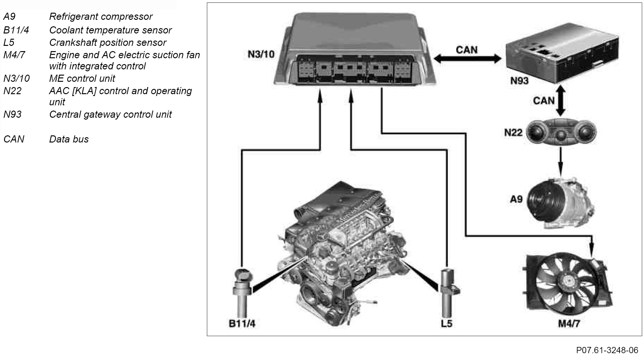 The status of the automatic air conditioning unit is transmitted via the CAN data bus by the AAC [KLA] control and operating unit, via the central gateway control unit to the motor electronics control unit. The fan specified speed is dependent on this and on the coolant temperature.