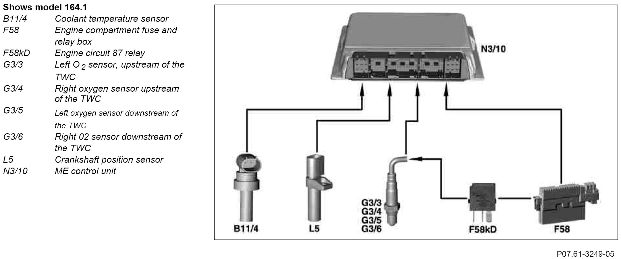 The O2 sensor heater is actuated and pulsed by the ME control unit by means of a ground signal. Each sensor heater has its own, short circuit proof output stage in the engine control unit with diagnosis. As a protection for the ceramic, the sensor temperature upstream of TWC is limited to approx. 350 °C in the condensation phase after cold start. The temperature is then controlled to approx. 700 °C after this. The internal resistance of the Nernst cells (which generate the lambda sensor signal) is evaluated.