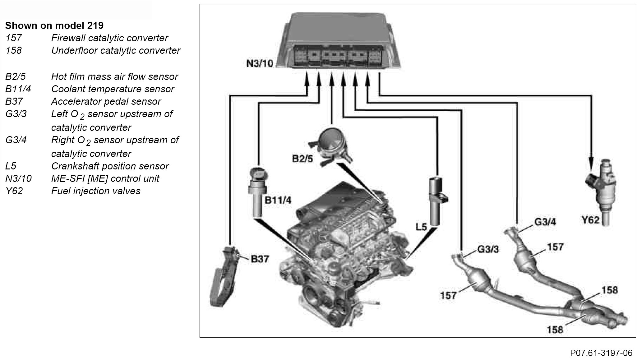 The O2 sensors upstream of the catalytic converter the oxygen concentration in the exhaust and transmit corresponding signals to the ME-SFI [ME] control unit. This changes the mixture composition so that in all engine operating statuses, the desired oxygen (usually (Lambda) =1) is set.