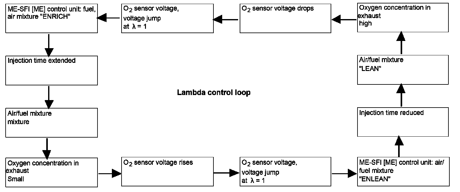 Assuming a leaner air/fuel mixture is produced. The consequence of this is that the O2 sensor voltage drops and the ME-SFI [ME] control unit compensates for this lean drift by enriching the mixture accordingly.