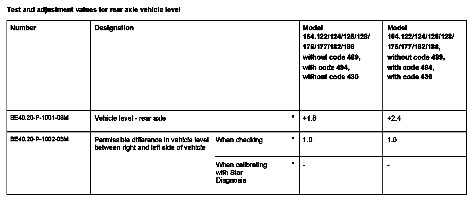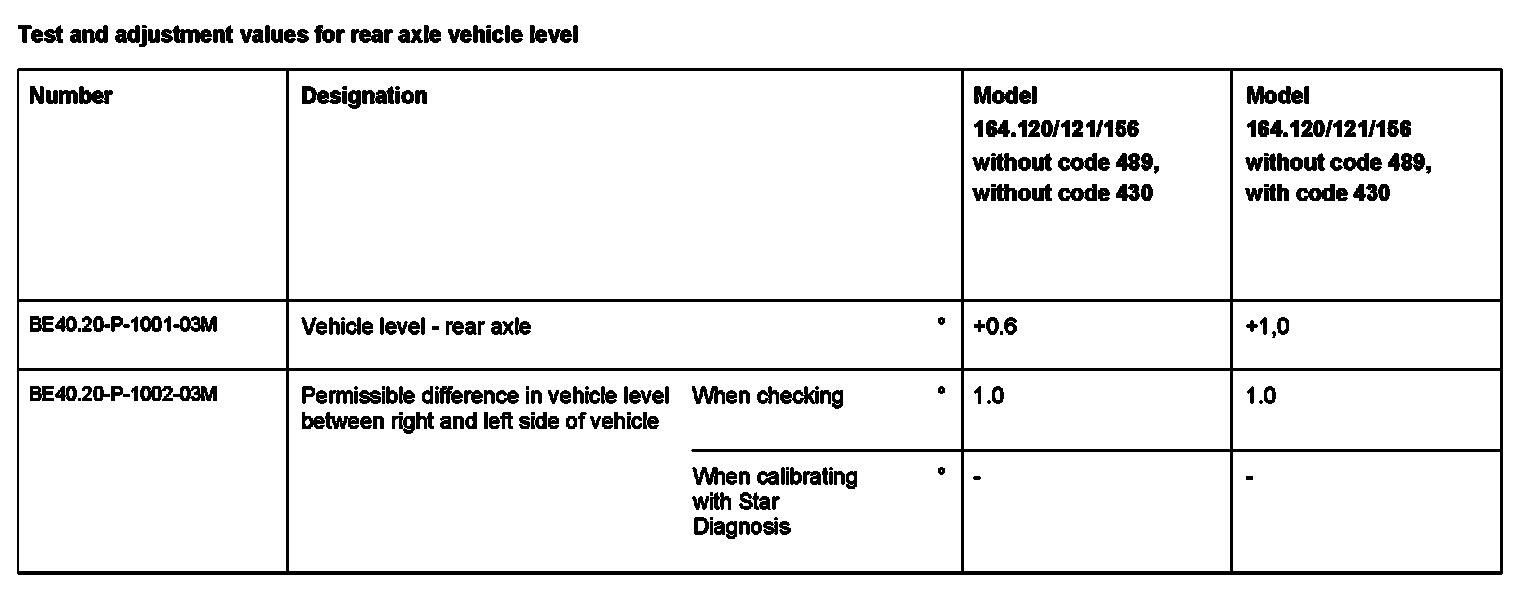 Test And Adjustment Values For Vehicle Level At Rear Axle: