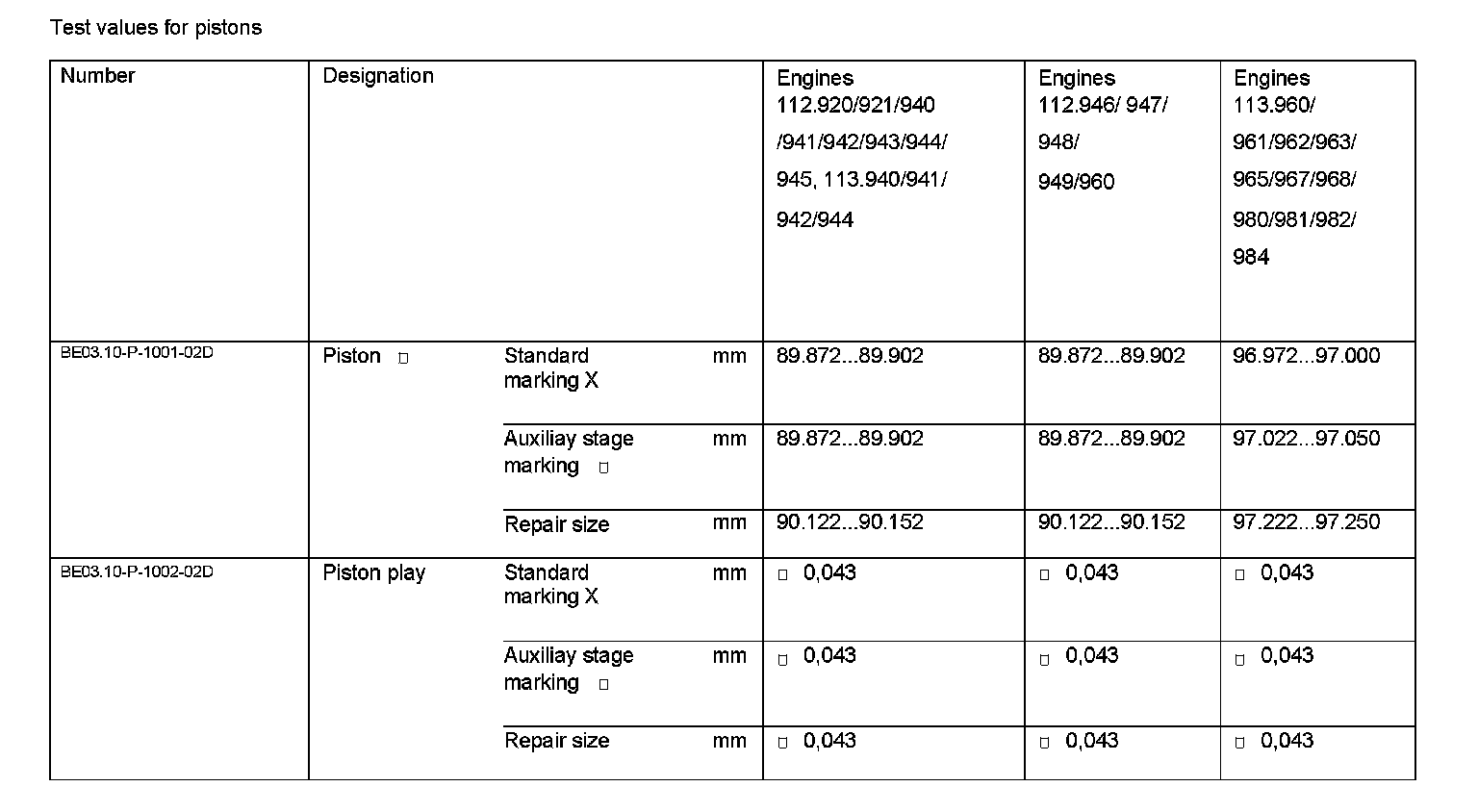 BE03.10-P-1000-02D Test Values For Pistons