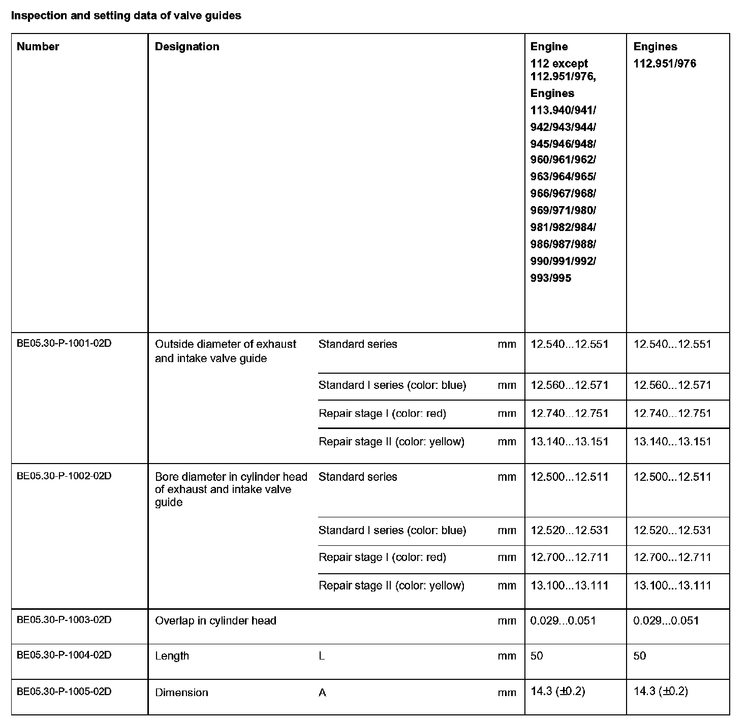Inspection and setting data of valve guides: