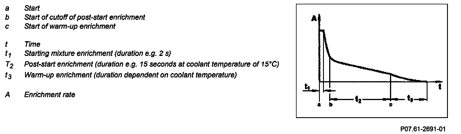 After a cold start the fuel-air mixture is enriched for a short time. The fuel which precipitates on the cylinder walls and the intake ports is compensated for by this enrichment and the engine runs smoothly. It is enriched sufficiently until a certain engine speed has stabilized (e.g. 1400 rpm for drive position "P" or "N" and a 30 °C coolant temperature for about 30 seconds).