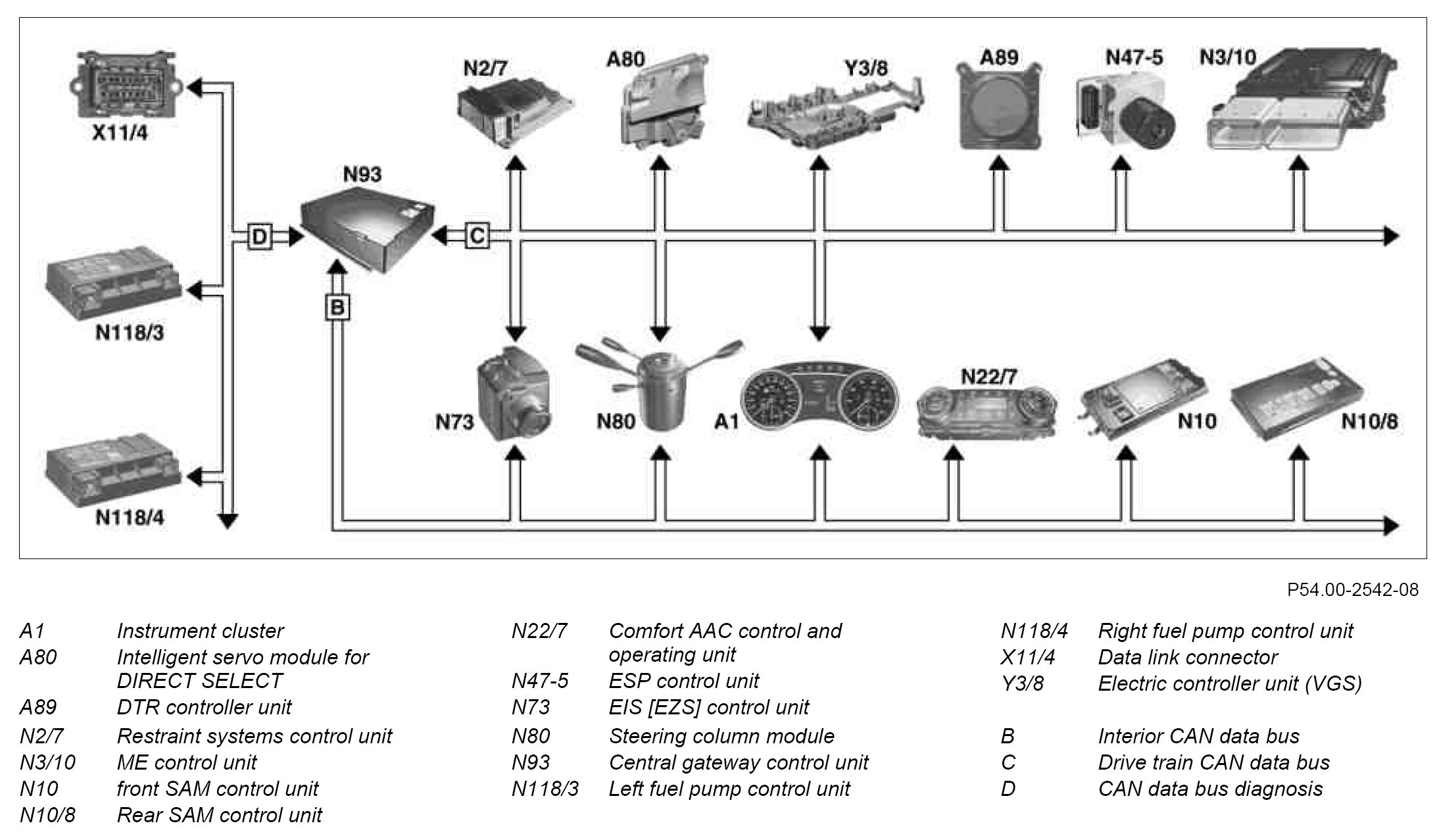 In the vehicle a distinction is made between the fast (500 kbit/s) drive train CAN data bus for the engine systems, transmission systems and chassis systems and the slower (83.3 kbit/s) interior CAN data bus for the systems in the vehicle interior.