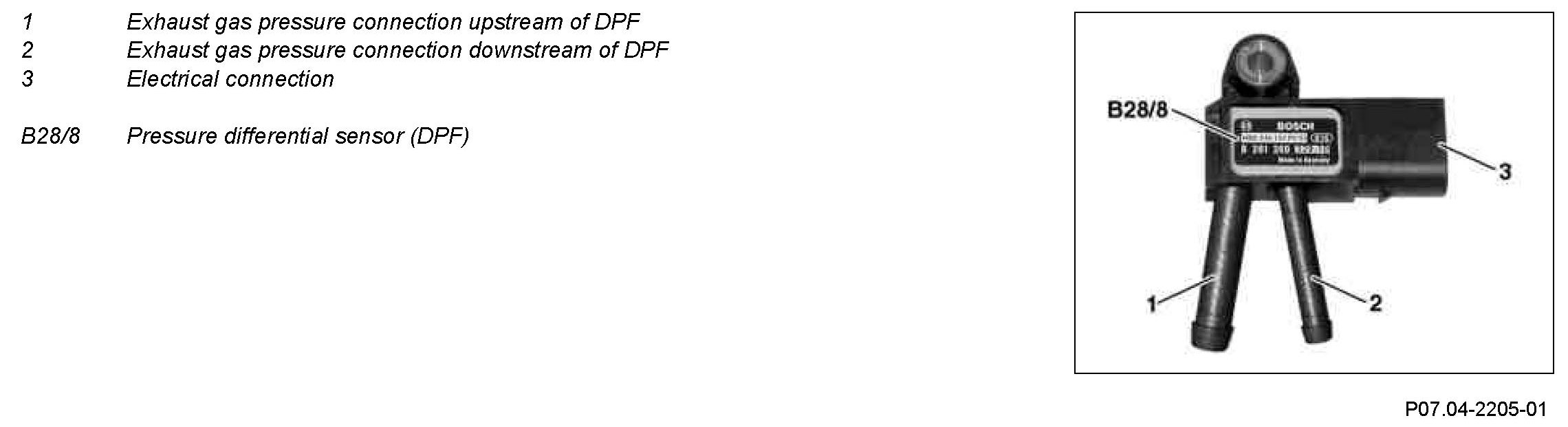 The pressure differential sensor (DPF) detects pressure difference between the exhaust gas pressure upstream and downstream of the DPF via the exhaust gas pressure lines upstream and downstream of the DPF.