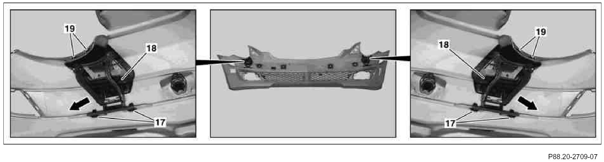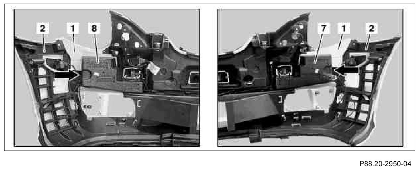 18. Insert right impact absorber (7) and left impact absorber (8) in front bumper paneling (1) and arrest.