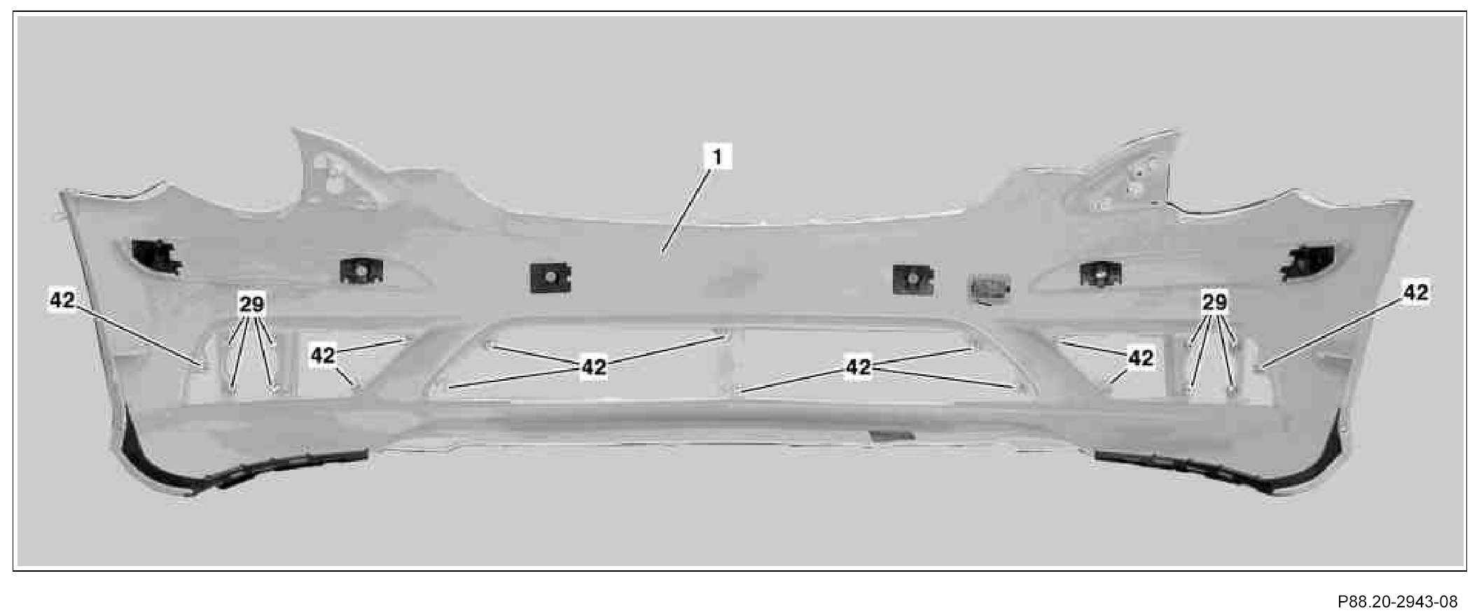 3. Insert sheet metal nuts for air ducting grate (42) (12 each) into front bumper paneling (1) (see picture).