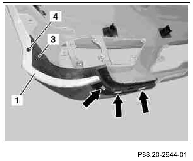 The reinforcements (3) must arrest correctly in the front bumper paneling (1) (see arrows).