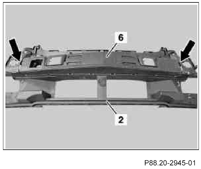 6. Insert center impact absorber (6) into front bumper basic carrier (2) and arrest..