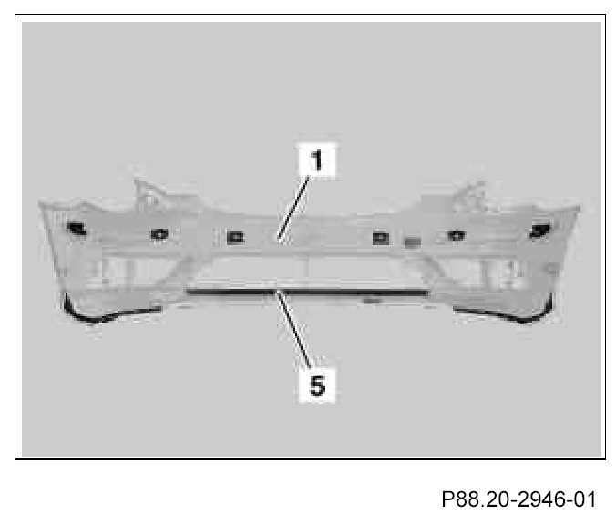 7. Insert bottom center reinforcements (5) into front bumper paneling (1).