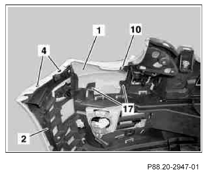 9. Fasten front bumper basic carrier (2) on right and left with two expansion rivets (dia. 8 mm) (17) each, two expansion rivets (dia. 5 mm) (4) and one blind rivet (10) in front bumper paneling (1).