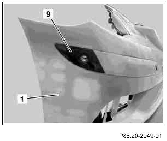10. Insert coverings (9) on right and left into front bumper paneling (1).