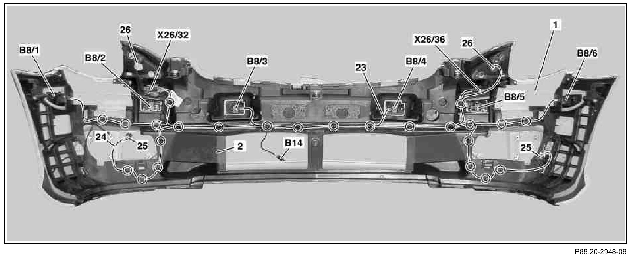 12.1. Lay PTS wiring harness (23) in front bumper basic carrier (2) as shown in picture and fasten to fastening shackles (circles).