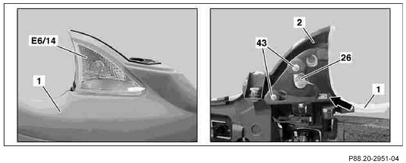 19. Insert left and right standing lamp and parking lamp (E6/14) into front bumper paneling (1) at front and fasten on inside with two combination nuts M5 (43) each.