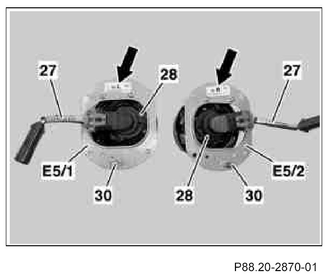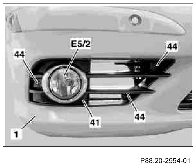 The left front fog lamp (E5/1) and right front fog lamp (E5/2) are different and marked according to the side of the vehicle (arrows), the AMG wiring harnesses (27) for the front fog lamps should point toward outside when installed.