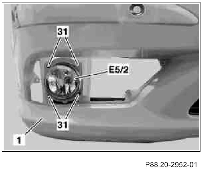 23.1. Insert left and right front fog lamp (E5/2) at front into front bumper paneling (1), align and fasten with bolts (31).