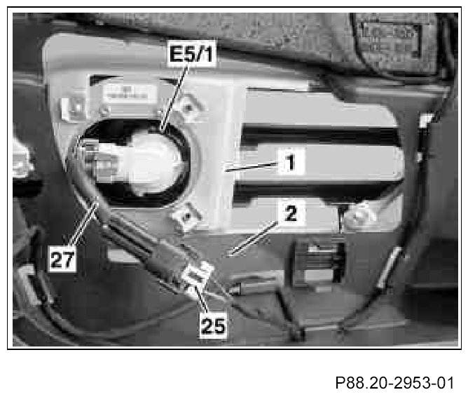 24.1. Connect left front fog lamp (E5/1) and right front fog lamp with AMG wiring harness (27) to cornering illumination/front fog lamp connector (25) to cornering illumination/front fog lamp wiring harness and temperature sensor.