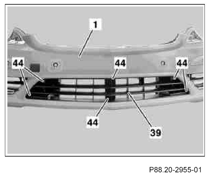 26. Insert center air ducting grate (39) into front bumper paneling (1), align and fasten with six 3.5 x 22 bolts (44).
