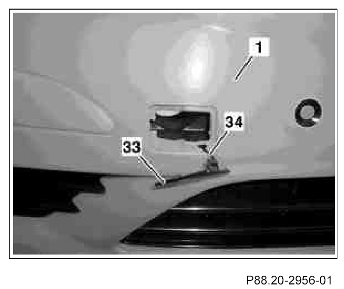 27. Hook towing eye cover (33) with check strap (34) into front bumper paneling (1) and clip in towing eye cover (33).