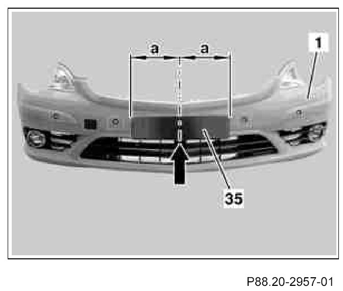 Use license plate frame (35) as template for marking holes. The distance (a) between the center and the outer edges of the license plate frame (35) should be equal (use center strut in center air passage as orientation aid). Align license plate frame (35) on contour of front bumper paneling (1).