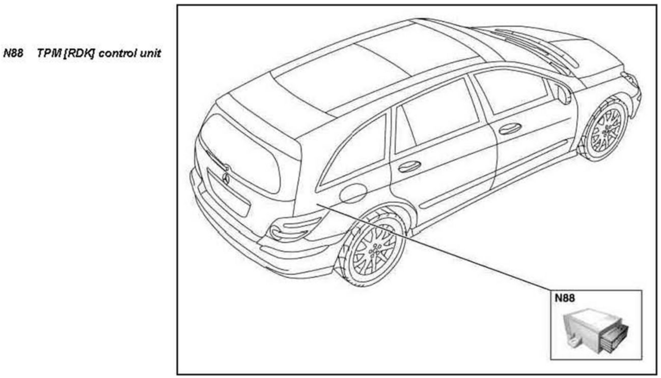 The TPM [RDK] control unit (N88) is located in the luggage compartment at the right on the wheelhouse.