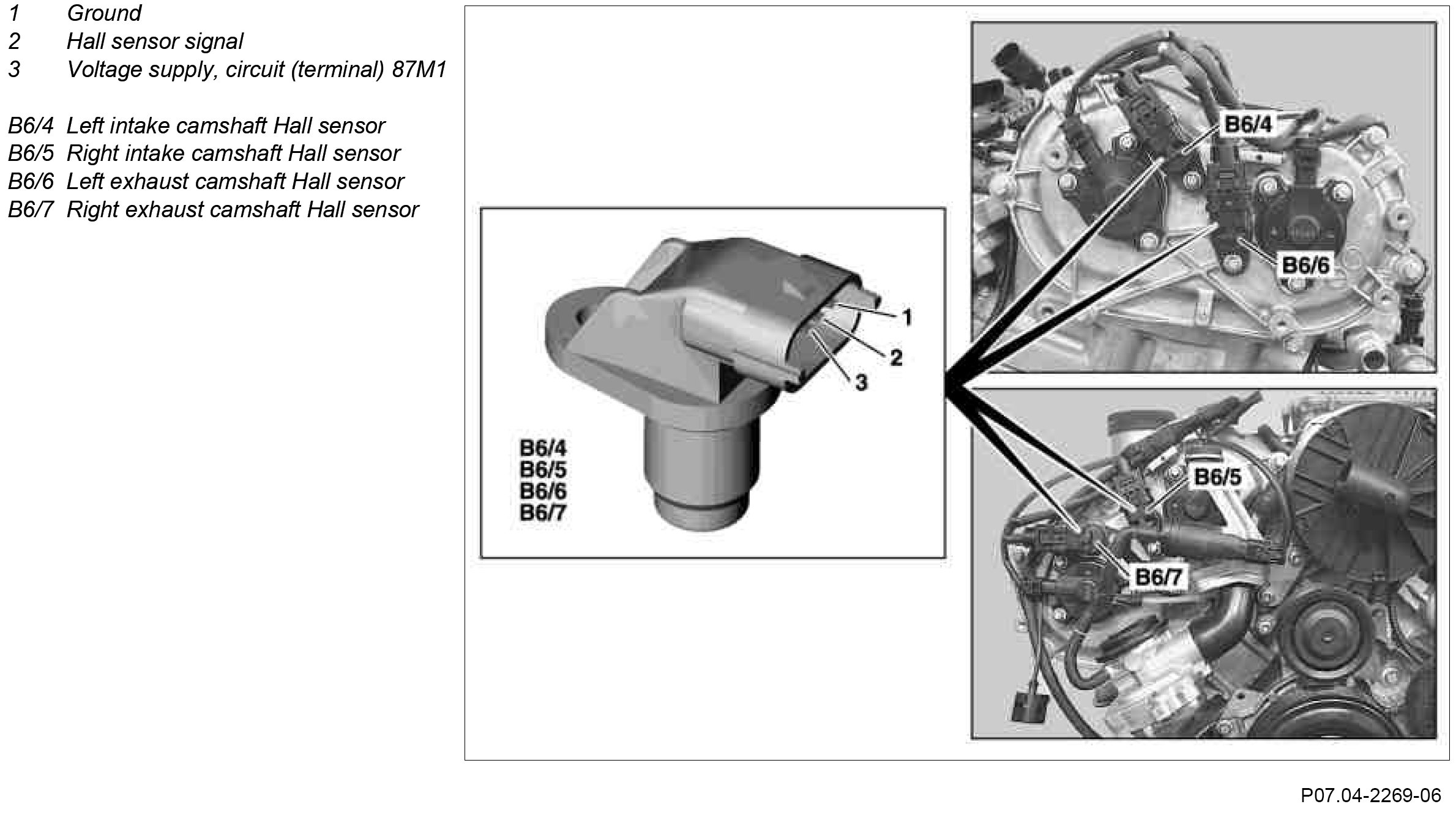 The camshaft Hall sensors are located before the respective camshaft.