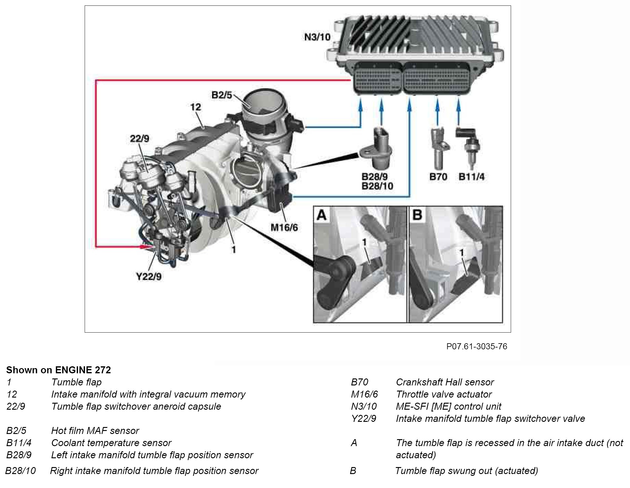 At partial load, tumble flaps can be fully swung out in each cylinder intake port in the intake manifold. This closes the intake manifold by around 50%. The flow speed of the intake air is increased and allows for improved distribution of the fuel/air mixture in the combustion chamber.