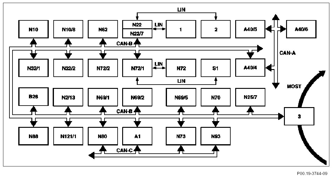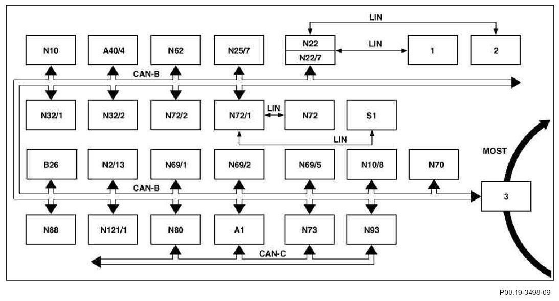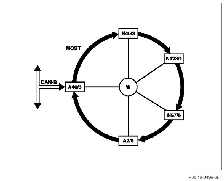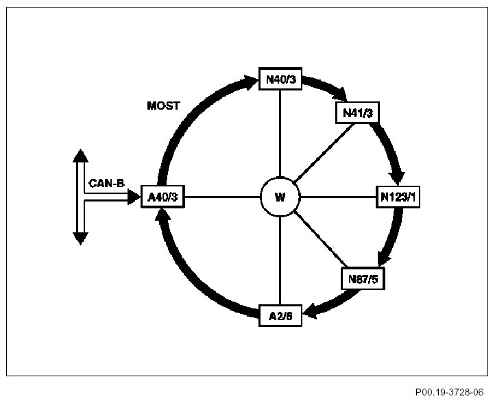 The radio or the COMAND operating, display and controller unit forms the interface (gateway) for data exchange between the MOST and CAN-B. The central gateway control unit is the interface for data interchange between the CAN-B and the CAN-C.