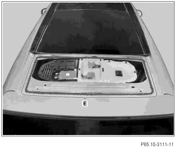 2 Guide application nozzle along gluing surface (area E) on body flange; press out adhesive evenly.